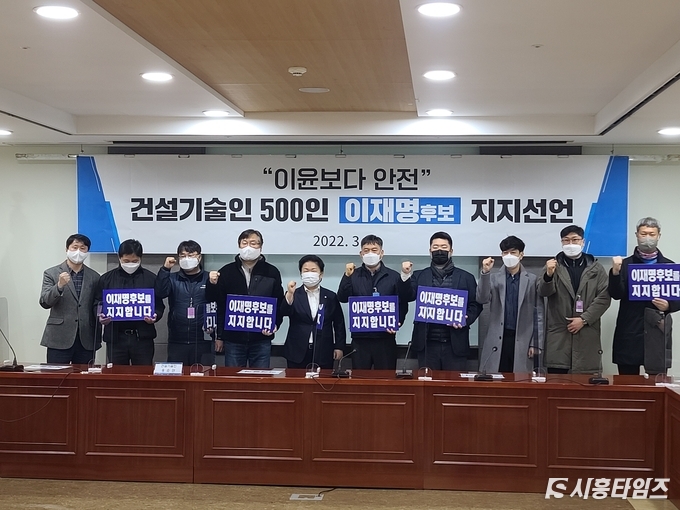 [시흥타임즈] 전국 건설기술인 500명이 더불어민주당 이재명 후보에 대한 공식 지지 선언에 나섰다.건설기술인 대표단은 4일 국회의원회관 제8간담회실에서 더불어민주당 문정복 국회의원(시흥갑·국토교통위원회)과 함께 지지선언식을 갖고 “이재명 후보는 이윤보다 안전을 추구하는 대통령”이라며 “안전한 건설현장을 만들 이 후보의 공약과 정책을 환영한다”고 밝혔다.