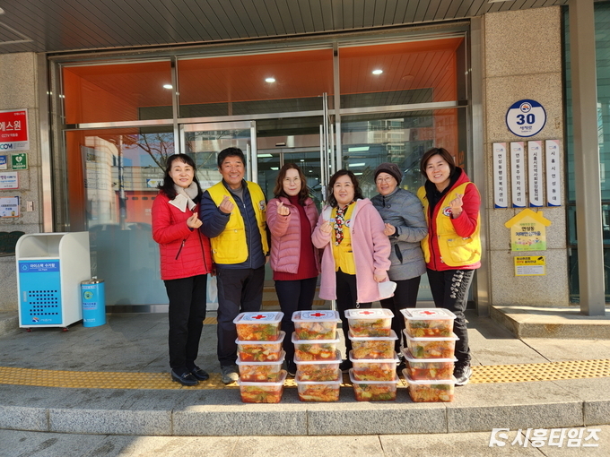 [시흥타임즈] 연성동 행정복지센터(동장 김상동)는 지난 6일 대한적십자 시흥연성·장곡봉사회(회장 차혜순)로부터 연성동 저소득 계층을 위해 손수 만든 사랑의 김장김치 160kg를 전달받았다고 밝혔다. 대한적십자 시흥연성·장곡봉사회는 정기적으로 독거 어르신과 저소득 취약계층을 위해 반찬 만들기, 이불빨래 봉사, 생활환경 정비 등 여러 가지 다양한 활동을 하며 따뜻한 지역사회 만들기에 적극 동참하고 있다.