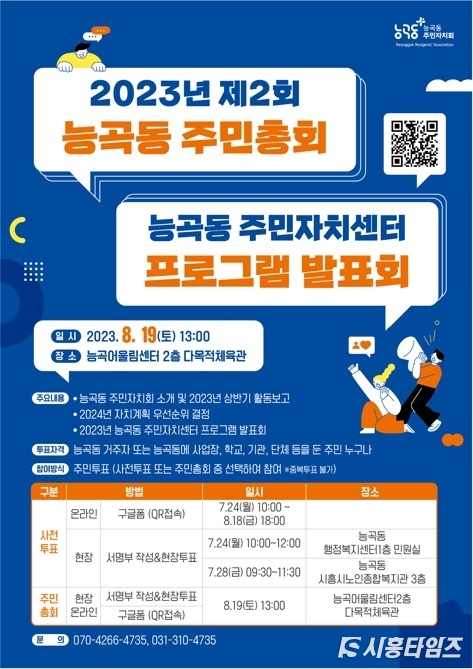 [시흥타임즈] 능곡동 주민자치회(회장 이관섭)가 오는 8월 19일 능곡어울림센터 2층 다목적체육관에서 ‘2023년 제2회 능곡동 주민총회’를 개최한다.능곡동 주민자치회는 지속적인 회의와 토론을 통해 공공성, 실효성 있는 생활 의제를 생각하고 발굴해 냈다. 발굴된 자치계획사업 12건을 주민총회에서 공개한다. 주민들은 꼭 시행했으면 하는 3건의 자치계획을 투표해, 투표 결과에 따라 2024년도 사업의 우선순위를 결정한다.