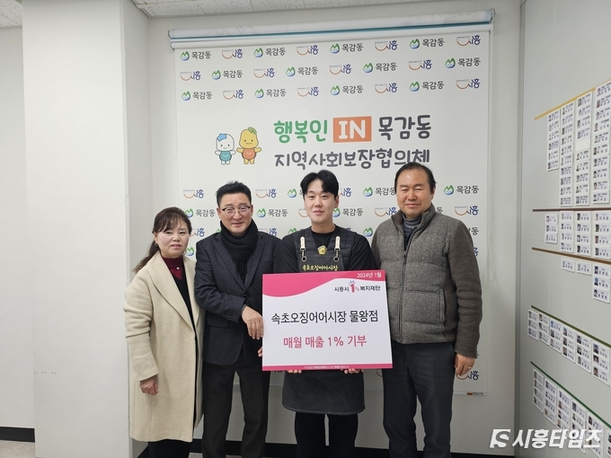 [시흥타임즈] 목감동 행정복지센터(동장 정호종)에 지난 29일 속초오징어어시장 물왕리점이 방문해 관내 취약계층을 돕기 위해 매월 매출액의 1%를 지속해서 후원하겠다는 뜻을 전했다. 지난 1월 19일에 개업한 생선회 전문 식당인 속초오징어어시장 물왕리점은 개업 기념으로 화환 대신 받은 축하금 60만 원을 이날 목감동에 기부하는 온정을 베풀었다.