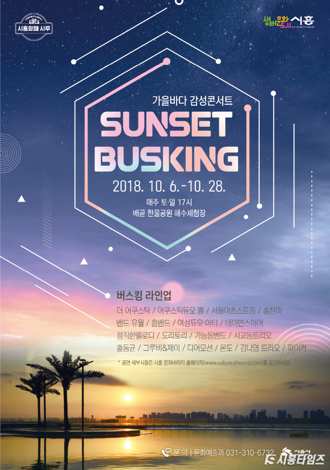 시흥시가 10월 6일부터 10월 28일까지 매주 토, 일요일 17시부터 배곧한울공원(해수체험장)에서 낙조가 아름다운 서해바다를 배경으로 선셋 버스킹 공연을 진행한다.올해 조성이 완료된 배곧한울공원 해수체험장은 이국적인 풀장모습과 서해바다의 멋진 스카이라인이 어우러져 해질녘 아름다운 풍경을 볼 수 있는 곳이다.