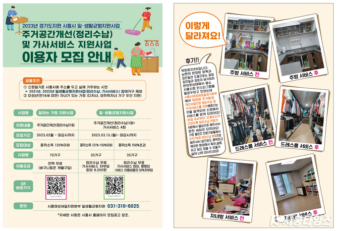시는 올해 총 70가구를 지원하며, 가구당 정리수납 1회와 가사서비스 4회를 지원한다. 지원 자격은 시흥시에 주소지를 두고 실제 거주하는 워킹맘, 맞벌이가정, 법정 한부모(워킹대디 포함) 가정으로 만 18세 미만의 자녀가 있어야 되며, 초등학교 다자녀 가정은 우선 지원된다.