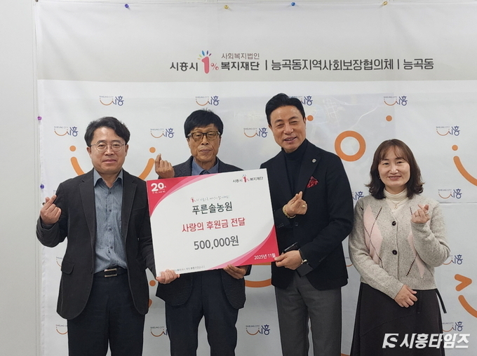 [시흥타임즈] 시흥시 능곡동 행정복지센터(동장 이상익)는 지난 11월 14일 푸른솔농원으로부터 관내 어려운 이웃을 위한 후원금 50만 원을 기탁받았다.