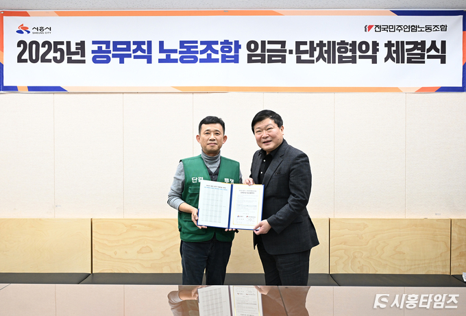 [시흥타임즈] 시흥시(시장 임병택)는 지난 11월 26일 시청 다슬방에서 교섭대표 노동조합인 전국민주연합노동조합 시흥지부와 2025년도 공무직 임금ㆍ단체협약을 체결했다. 올해 교섭은 지난 9월 10일 상견례를 시작으로 약 2개월간 총 7차례의 실무교섭을 통해 진행됐으며, 상호 입장을 조율하기 위한 세부 논의를 거쳐 임금 협약과 단체협약 내용이 확정됐다.