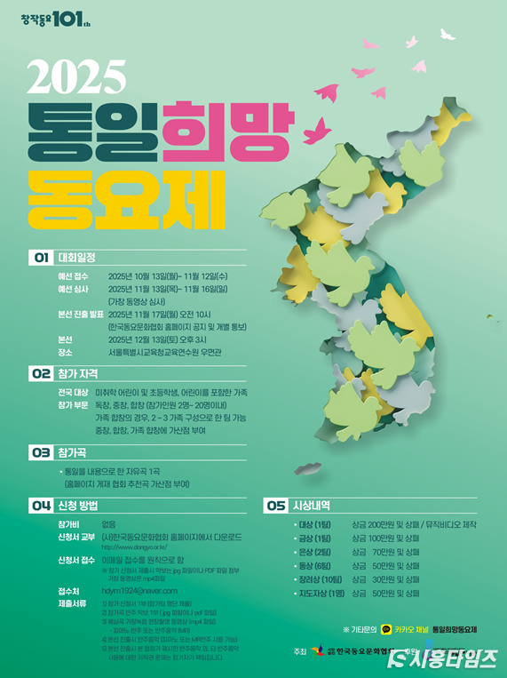 [시흥타임즈] 광복 80주년을 맞아 어린이들이 평화와 통일의 메시지를 노래로 전하는 ‘2025 통일희망동요제’가 열린다. 사단법인 한국동요문화협회는 오는 12월 13일 오후 3시, 서울특별시교육청 교육연수원 우면관에서 본 행사를 개최한다고 5일 밝혔다. 이번 대회는 ‘통일과 나눔’ 재단의 후원으로 진행되며, 전국에서 선발된 어린이 및 가족팀이 참여해 한반도의 미래를 향한 희망을 노래한다.올해는 우리 민족이 광복을 맞은 지 80년이 되는 뜻깊은 해로, 이번 대회는 미래 세대가 통일의 의미를 직접 이해하고 전하는 계기를 마련하기 위해 기획됐다. 총 20개 팀이 무대에 올라 통일을 소재로 한 다양한 동요를 선보일 예정이며, 어린이들의 순수한 목소리를 통해 화합과 평화의 메시지가 관객들에게 전달될 예정이다.
