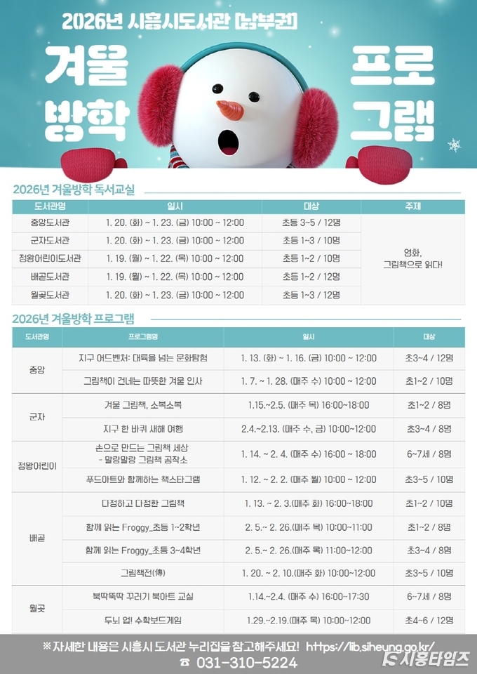 [시흥타임즈] 시흥시중앙도서관 등 5개 남부권 공공도서관(중앙ㆍ군자ㆍ정왕어린이ㆍ배곧ㆍ월곶)은 겨울방학을 맞이한 어린이들을 위해 ‘2026년 겨울독서교실 및 겨울방학 프로그램’을 오는 2026년 1월 7일부터 2월 26일까지 운영한다.