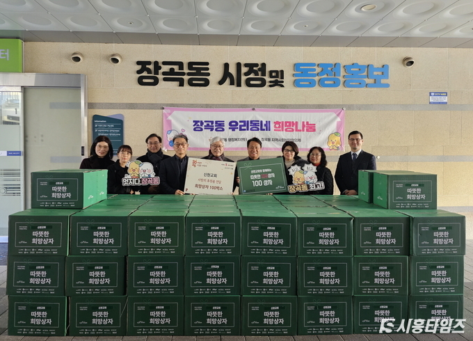 [시흥타임즈] 연말을 맞아 교회를 중심으로 한 나눔의 손길이 계속되는 가운데 지난 12월 17일 신현교회에서 취약계층의 따뜻한 겨울나기를 돕기 위해 장곡동 행정복지센터(동장 도영찬)에 ‘따뜻한 희망상자’ 100개를 전달했다.