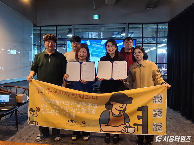 [시흥타임즈] 시흥시 발달장애인 평생교육지원센터는 사회적 벤처기업인 ㈜컨텐츠다의 발달장애인 지원사업 사회공헌 프로그램에 선정됐다. 이에 따라 지난 12월 19일 경기도 부천시의 컨텐츠다 본사에서 2천만 원 상당의 가상현실(VR) 교육 콘텐츠 패키지와 메타 퀘스트(Meta Quest) 2기 증정식이 열렸다.이와 함께 양 기관은 발달장애인 교육 접근성 강화, 혁신적인 학습 환경 조성 등 발달장애인 평생교육 발전을 위한 상호 협력 양해각서를 체결하며 협력 관계를 공식화했다.