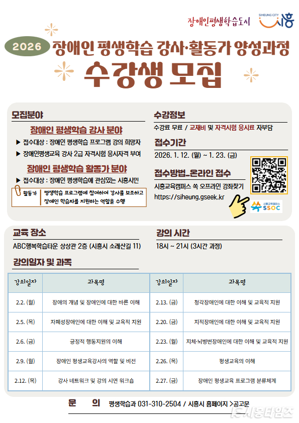 [시흥타임즈] 시흥시(시장 임병택)는 오는 1월 23일까지 ‘2026년 장애인 평생학습 전문 강사와 활동가 양성 과정’ 수강생을 모집한다.이번 과정은 장애인 평생학습 현장의 전문성을 높이고, 장애 유형과 학습 특성을 고려한 맞춤형 학습 서비스를 제공할 인적 자원을 발굴하기 위해 마련됐다. 특히 올해는 전문 교육기관인 ‘한국장애인평생교육연구소’와 연계해 장애인평생교육강사 2급 자격증 취득 과정으로 운영하며 교육의 전문성과 내실을 강화했다.