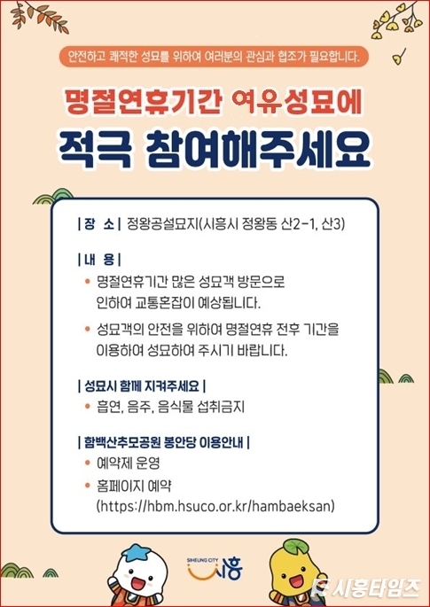 [시흥타임즈] 시흥시는 우리 민족 고유의 명절인 설을 맞아 성묘객 밀집에 따른 안전사고를 예방하고 시민 편의 증진을 위해 명절 연휴 전후 여유 성묘 캠페인을 추진하고 있다.정왕공설묘지(정왕동 산2-1, 산 3)는 시흥시 유일의 공설묘지로, 매년 설과 추석 등 명절 당일에 매년 많은 성묘객이 방문하고 있다. 특히 올해 설 명절에는 성묘객이 예년보다 더 증가할 것으로 예상돼 교통 혼잡과 주차 불편, 안전사고를 최소화하기 위해 명절 전·후 분산 방문에 대한 시민들의 적극적인 협조가 요구된다.