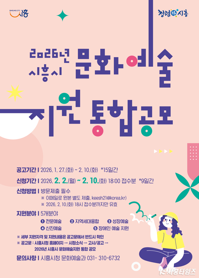 [시흥타임즈] 시흥시는 지역 문화예술인의 안정적인 창작·발전 활동을 적극 장려하고 시민의 문화 향유 기회를 제공하고자 ‘2026년도 문화예술지원 사업’을 추진한다.‘2026 문화예술지원 통합 공모사업’은 총 3억 2천만 원 규모로 분야별 지원체계를 마련해 문화예술인들의 창작 역량을 강화하고, 시민이 일상에서 다양한 문화예술을 접할 수 있도록 지원할 계획이다.