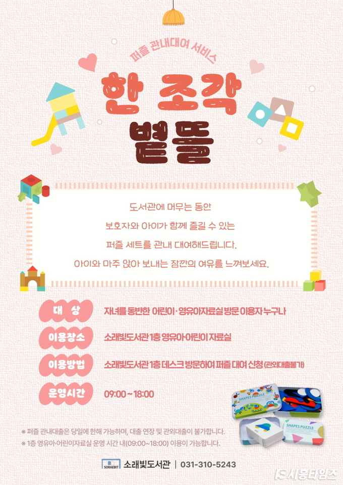 [시흥타임즈] 시흥시 소래빛도서관은 어린이를 위한 관내 퍼즐 대여 서비스 ‘한 조각 볕뜰’을 새롭게 선보인다. 이 서비스는 빠른 영상과 즉각적인 자극에 익숙해진 아이들이 잠시 속도를 늦추고, 손끝 감각과 집중력을 자연스럽게 기를 수 있도록 마련됐다.‘한 조각 볕뜰’은 스마트폰 화면 대신 퍼즐 조각을 손에 쥐고 부모와 아이가 나란히 앉아 한 조각씩 맞춰 가는 경험을 제안한다. 이를 통해 도서관을 책 빌리는 장소에서 부모와 아이가 천천히 함께 머무르며 이야기를 나누는 장소로 확장했다.