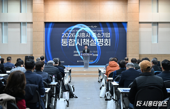[시흥타임즈] 시흥시(시장 임병택)는 지난 2월 9일 시흥비즈니스센터 2층 컨벤션홀에서 ‘2026년 시흥시 중소기업 통합시책설명회’를 열었다.이번 설명회에는 관내 중소기업인과 시흥시민 등 300여 명이 참석했으며, 시흥시를 비롯해 시흥산업진흥원, 중소벤처기업부 등 23개 기업지원 기관이 참여해 다양한 기업지원 정책을 소개했다.