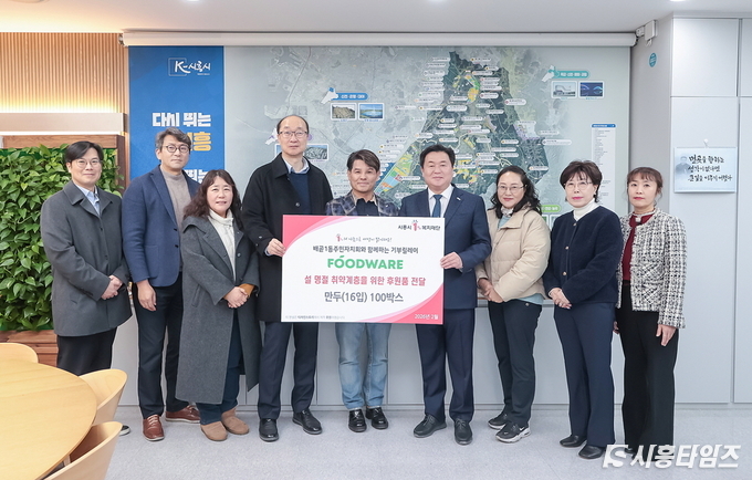 [시흥타임즈] 시흥시(시장 임병택)는 지난 2월 11일 ㈜푸드웨어가 저소득층 지원을 위해 냉동만두 약 1천600여 개를 시흥시1퍼센트복지재단에 전달했다고 밝혔다.이번 후원에 참여한 ㈜푸드웨어는 총면적 2만9,069㎡ 규모의 생산시설을 갖춘 국내 최대 만두 단일 품목 제조기업으로, 2014년 국내 최초로 일본 후생성의 육가공 열처리 공장 지정을 받았다. 이어 2022년에는 일본을 비롯한 6개국에 약 246억 원 규모의 제품을 수출하며 케이 푸드 확산에 기여하고 있다.