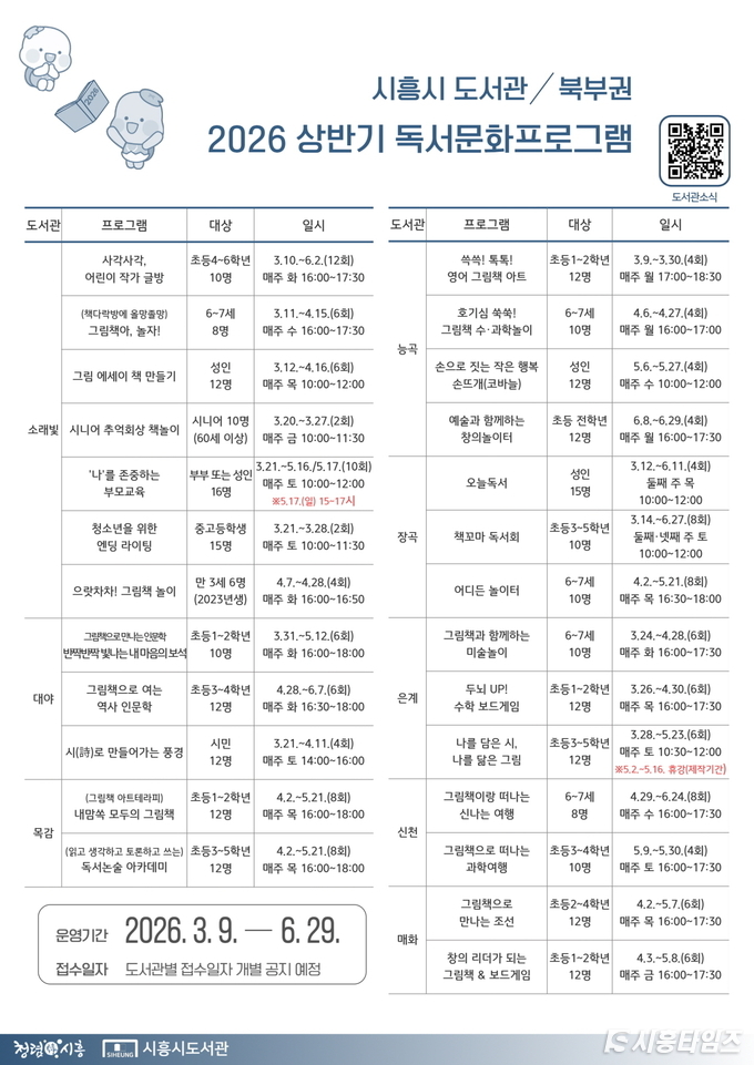 [시흥타임즈] 시흥시 북부권 8개 공공도서관(소래빛ㆍ대야ㆍ목감ㆍ능곡ㆍ장곡ㆍ은계ㆍ신천ㆍ매화)은 오는 3월부터 6월까지 상반기 독서문화 프로그램 26개를 운영하고, 시민 292명을 대상으로 다양한 독서·문화 체험 기회를 제공한다.