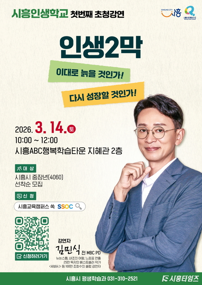 [시흥타임즈] 시흥시(시장 임병택)는 4060 중장년층의 새로운 도약과 체계적인 생애 설계를 지원하는 평생학습 브랜드 ‘시흥인생학교’를 새롭게 선보이고, 이를 기념하는 초청 강연을 개최한다.‘시흥인생학교’는 인문 교양, 진로 탐색, 사회참여 등 다양한 교육 프로그램을 월별로 운영하는 중장년 특화 평생학습 과정이다. 이를 통해 40대~60대 중장년 시민들이 인생 후반기를 주도적으로 설계하고 지속적인 성장을 이어갈 수 있는 환경을 제공한다.