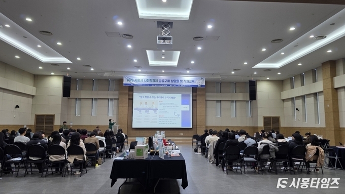 [시흥타임즈] 시흥시(시장 임병택)는 지난 3월 6일 시흥비즈니스센터 컨벤션홀에서 시청 각 부서 및 동 행정복지센터의 사회적경제기업 공공구매 사업 담당자를 대상으로 ‘2026년 사회적경제기업 공공기관 우선구매 상담회 및 직원교육’을 실시했다.이번 행사는 교육과 상담회를 연계해 운영함으로써 사회적경제기업에 대한 공직자들의 이해도를 높이고, 공공기관 우선구매 활성화를 통해 기업의 판로 확대와 지역 사회적경제 생태계 조성을 지원하기 위해 마련됐다.