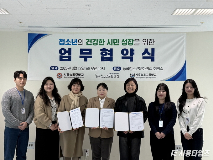 [시흥타임즈] 시흥시청소년청년재단의 시흥시능곡청소년문화의집은 지난 3월 12일 시흥시능곡청소년문화의집 회의실에서 시흥능곡중학교, 시흥능곡고등학교와 청소년이 건강한 시민으로 성장할 수 있는 기반 마련을 위한 상호 업무협약을 체결했다.이번 협약은 지역 청소년들이 사회 속에서 스스로 생각하고 참여하는 주도적인 민주시민으로 성장할 수 있는 기반을 마련하고, 학교와 청소년 시설 간 유기적인 교육 협력망을 구축하기 위해 추진됐다.
