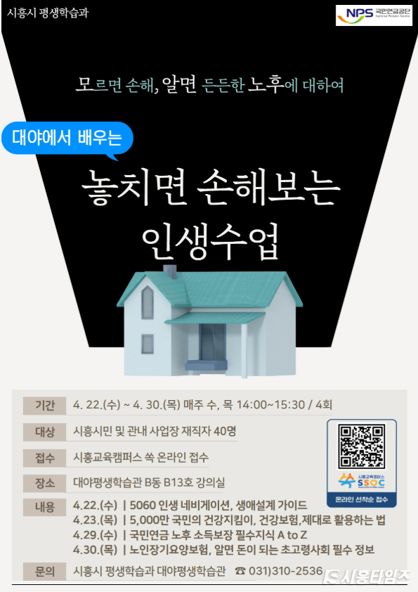 프로그램은 총 4회 과정으로, 시흥시민과 관내 사업장 재직자 40명을 대상으로 진행된다. 주요 내용은 ▲5060 인생 네비게이션, 생애설계 가이드(4월 22일) ▲건강보험 제대로 활용하는 법(4월 23일) ▲국민연금 노후 소득보장 필수지식(4월 29일) ▲노인장기요양보험 활용 정보(4월 30일) 등으로 구성돼, 중장년층의 안정적인 노후 준비를 위한 필수 정보를 제공한다.