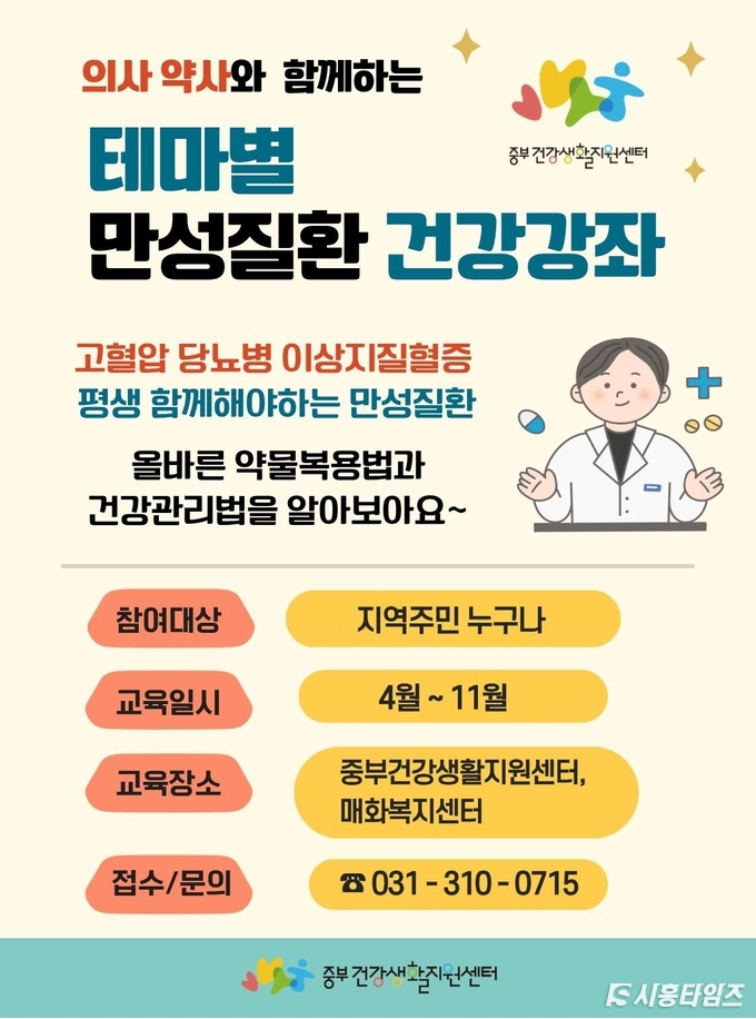 [시흥타임즈] 시흥시(시장 임병택)는 지역주민의 건강한 생활 실천을 돕기 위해 ‘2026년 테마별 만성질환 건강강좌’를 오는 4월부터 11월까지 중부건강생활지원센터와 매화복지관에서 운영한다.