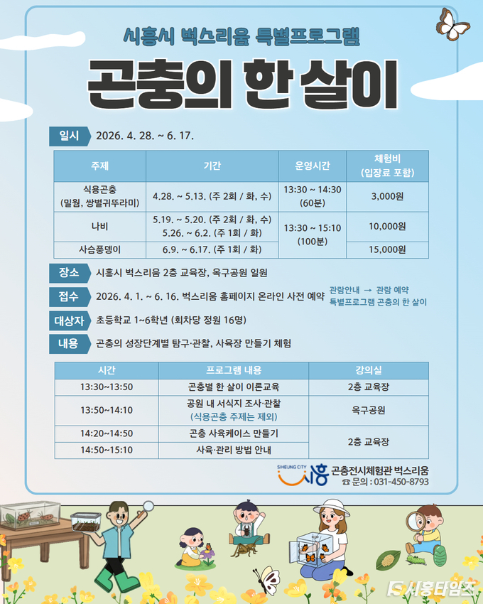 [시흥타임즈] 시흥시 곤충체험전시관 ‘벅스리움’은 오는 4월 28일부터 6월 17일까지 초등학생을 대상으로 특별프로그램 ‘곤충의 한 살이’를 운영한다.이번 프로그램은 초등학생들이 곤충의 성장 과정을 직접 탐구ㆍ관찰하며 생태를 이해할 수 있도록 마련됐다. 특히 초등학교 교과과정과 연계한 심화형 체험 프로그램으로 구성해 곤충과 생태계에 대한 이해를 더 체계적으로 높일 수 있도록 했다.