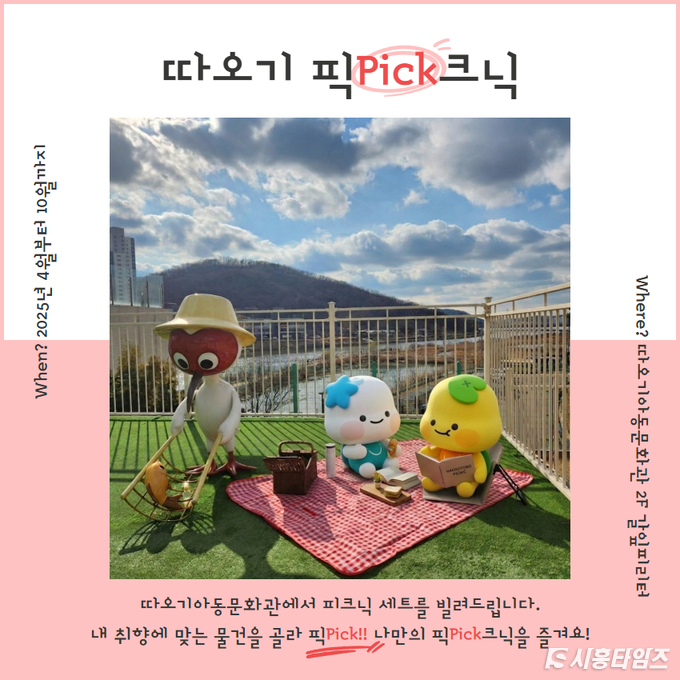 [시흥타임즈] 시흥시 따오기아동문화관은 가족 단위 관람객의 여가 활성화를 위해 야외 체험 프로그램으로 ‘따오기픽(pick)크닉’을 오는 4월 18일부터 10월 말까지 운영한다. 이번 프로그램은 자연 속에서 문화와 여가를 동시에 즐길 수 있는 체험형 콘텐츠로 방문객 누구나 간편하게 소풍(피크닉)을 즐길 수 있도록 구성됐다.