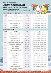 [시흥타임즈] 시흥시가 겨울방학을 맞아 북부권 8개 공공도서관(소래빛ㆍ대야ㆍ목감ㆍ능곡ㆍ장곡ㆍ은계ㆍ신천ㆍ매화)에서 1월 6일부터 2월 26일까지 겨울독서교실 및 겨울방학 프로그램을 운영한다. 이번 프로그램은 관내 초등학생과 유아 272명을 대상으로 진행되며, 책을 기반으로 창의적 탐구와 독서 습관 형성에 도움을 주는 25개의 다채로운 강좌로 구성됐다. 다양한 주제로 펼쳐지는 ‘겨울독서교실’은 각 도서관의 특화주제에 맞춰 어린이들의 상상력과 사고력을 자극하는 프로그램으로 꾸려졌다. 도서관별 세부 프로그램은 ▲소래빛도서관 ‘책과 함께 떠나는 두근두근 도서관 탐험대’ ▲대야도서관 ‘흥나는 놀이독서’ ▲목감도서관 ‘세계문학으로 배우는 마음 성장 독서 여행’▲능곡도서관 ‘예술과 만나는 세계 문화 여행’ ▲장곡도서관 ‘마음건강 톡톡’ ▲은계도서관 ‘그림책으로 읽는 포근한 세상’ 등이다. ‘겨울방학 프로그램’도 책을 기반으로 한 창의적이고 다양한 활동을 제공한다. 대표 프로그램으로는 ▲소래빛도서관 ‘내가 발견한 ‘우리’ 세상의 가장 빛나는 별’ ▲능곡도서관 ‘맛있는 문해력 요리’ ▲목감도서관 ‘그림책으로 떠나는 겨울 산책’ 등이 있으며, 아이들이 읽기 활동과 함께 창의·정
