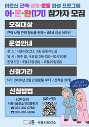 [시흥타임즈] 시흥시(시장 임병택)는 어르신들의 근력 향상과 낙상 예방을 위해 ‘어르신 근력ㆍ균형 운동 완성 프로그램(이하, 어ㆍ운ㆍ완)’ 1기 참가자를 모집한다. ‘어ㆍ운ㆍ완’은 보건복지부와 한국건강증진개발원이 개발한 어르신 맞춤형 근력ㆍ균형 운동 프로그램으로, 근력과 균형 능력을 체계적으로 향상해 보행 능력을 높이고 낙상 위험을 줄여 일상생활 기능 유지와 건강한 노후 생활을 지원하고자 추진된다. 이번 1기 과정은 3월 23일부터 6월 29일까지 운영되며, 매주 월ㆍ수요일 오전 9시 30분부터 10시 30분까지 시흥시보건소 3층 운동지도실에서 진행된다. 프로그램은 기본 적응운동(2주)과 유형별 운동(10주)으로 구성되며, 사전ㆍ사후 체력 검사를 통해 근력ㆍ유연성ㆍ심폐지구력 등의 변화와 향상 정도를 확인할 계획이다. 모집 대상은 근력 및 보행 능력 향상을 원하는 65세 이상 어르신으로, 선착순 20명을 모집한다. 신청 기간은 2월 23일부터이며, 정원 마감 시까지 신청받는다. 이형정 시흥시보건소장은 “근력과 균형 능력은 어르신의 독립적인 생활 유지에 매우 중요한 요소”라며 “체계적인 운동 프로그램을 통해 어르신들이 더욱 안전하고 활기찬 일상을 보내시길 바란다