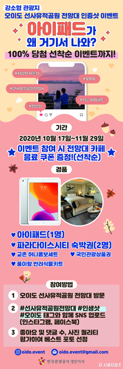 [시흥타임즈] 올 가을 시흥 오이도 선사유적공원 전망대에서 인증샷 이벤트를 개최한다. 한국관광공사 경인지사(지사장 김배호)가 <강소형 잠재관광지 발굴・육성 사업> 대상지로 선정한 시흥 오이도 유적에서 11월 29일까지 진행하는 이벤트이다. 경품은 아이패드 및 파라다이스시티 숙박권, 국민관광상품권 등이며, 당첨자는 12월 2일 인증샷 이벤트 인스타그램 계정(@oido.event)을 통해 발표할 예정이다. 이벤트 참여시 선착순으로 음료 쿠폰을 제공하며, 이벤트 종료 후 좋아요 및 댓글 수, 사진 퀄리티 등을 평가해 ‘베스트 포토’를 선정한다. 낙조가 아름다운 오이도 선사유적공원 전망대에서 인증샷을 촬영하고 필수 태그인 ‘#선사유적공원전망대’, ‘#인생샷’, ‘#시흥여행’과 함께 개인 SNS(인스타그램, 페이스북)에 사진을 업로드하면 해당 이벤트에 참여할 수 있다. 이벤트 문의는 이메일(oido.event@gmail.com)로 하면 된다. 한편 오이도 선사유적공원에서는 사회적 거리두기 1단계 시행에 맞춰 다양한 체험프로그램을 운영하고 있다. 시민강사가 운영하는 동화구연 등 9개 프로그램과 상설 프로그램을 통해 신석기시대 문화를 체험해 볼 수 있으며, 오