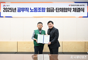 [시흥타임즈] 시흥시(시장 임병택)는 지난 11월 26일 시청 다슬방에서 교섭대표 노동조합인 전국민주연합노동조합 시흥지부와 2025년도 공무직 임금ㆍ단체협약을 체결했다. 올해 교섭은 지난 9월 10일 상견례를 시작으로 약 2개월간 총 7차례의 실무교섭을 통해 진행됐으며, 상호 입장을 조율하기 위한 세부 논의를 거쳐 임금 협약과 단체협약 내용이 확정됐다. 임금 및 단체협약에는 ▲2024년 임금 총액 대비 3% 인상 ▲민원 업무 수당 및 위험 근무수당 신설 ▲임금 테이블 통합(사무보조 직군과 영양사ㆍ의료급여 등 전문ㆍ단순 노무 직군을 ‘노무원’으로 통합) ▲경력 인정 기준 신설 ▲휴직 사유 신설 등 다양한 개선 사항이 포함됐다. 이번 합의는 공무직 근로자의 복리 증진과 근무 여건 향상을 위해 노사 양측이 지속적으로 의견을 조율하며 마련한 것으로, 안정적이고 효율적인 근무 환경을 만드는 데 중요한 기반이 될 것으로 기대된다. 김기범 전국민주연합노동조합 시흥지부장은 “같은 시흥시 직원으로서 상생의 자세로 한 방향을 바라볼 수 있도록 협력해 준 시흥시에 감사드린다”라며, “이번 협약을 통해 조합원들이 더 안정적인 근무 환경에서 시정 발전에 기여할 수 있기를 바란다”라