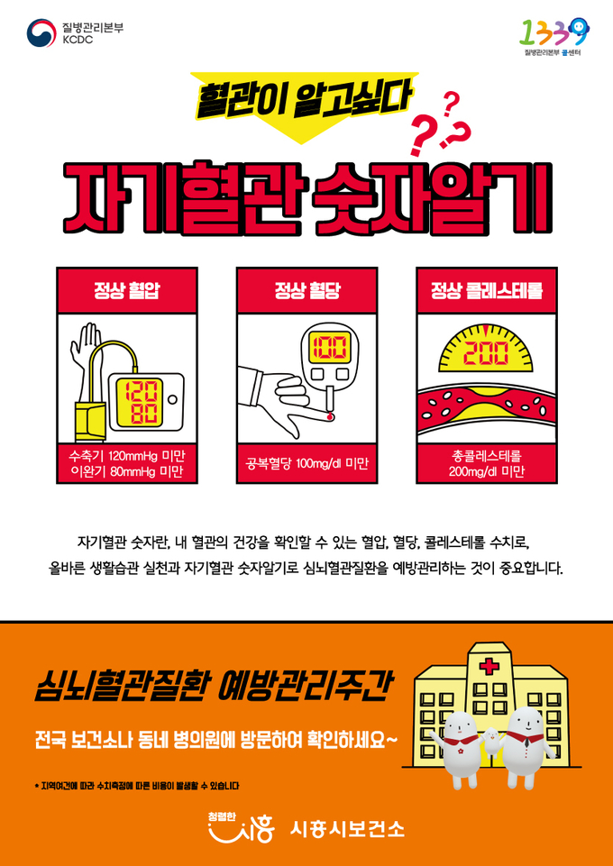 한편, 시흥시보건소에서는 심뇌혈관질환(고혈압, 당뇨병, 이상지질혈증, 심근경색, 뇌졸중 등)에 대해 전화상담, 모바일교육 등 각종 교육자료 배달서비스도 진행하고 있다. 관심 있는 주민은 시흥시보건소 통합상담실(310-5856, 5968)로 문의하면 된다.