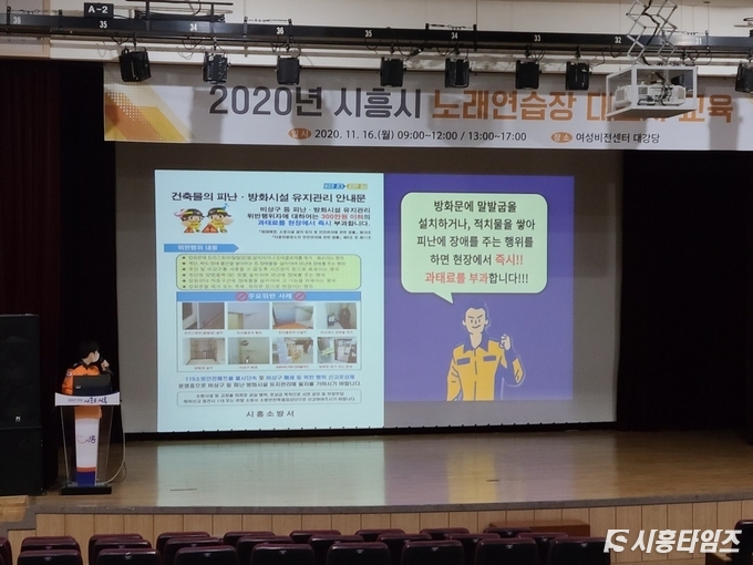 [시흥타임즈] 시흥시가 지난 16일 정왕 여성비전센터 대강당에서 노래연습장 대표자 59명이 참석한 가운데 2020년 노래연습장업 대표자 법정교육을 가졌다.시흥시가 주관해 실시한 이번 교육은 총 3시간에 걸쳐 진행됐다. 소방·전기안전 및「음악산업진흥에 관한 법률」상의 노래연습장업자의 준수사항과 코로나 19관련 다중이용업소(중점관리시설)인 노래연습장의 핵심방역수칙 등의 내용으로 교육을 구성했다.