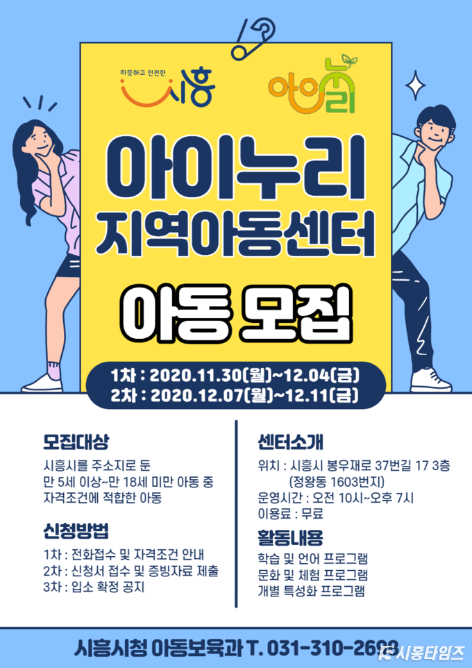 ‘아이누리 지역아동센터’는 올 12월 말 운영을 시작할 예정이다. 아동보육과는 오는 11일까지 정왕권 동 행정복지센터, 초등학교, 다문화관련기관 등을 대상으로 센터 운영을 위한 아동모집, 센터운영에 대한 집중 홍보를 펼칠 계획이다.