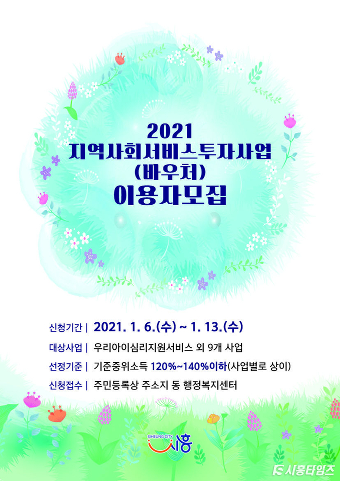 [시흥타임즈] 시흥시가 2021년도 지역사회서비스투자사업 바우처 이용자를 1월 6일부터 13일까지 7일간 모집한다.지역사회서비스투자사업은 지역주민의 삶의 질 향상을 위해 지역 특성과 주민의 수요에 맞는 사회서비스를 지원하는 사업으로, 이용자들에게 이용권(바우처)을 지급하는 방식으로 서비스를 제공하는 사업이다.