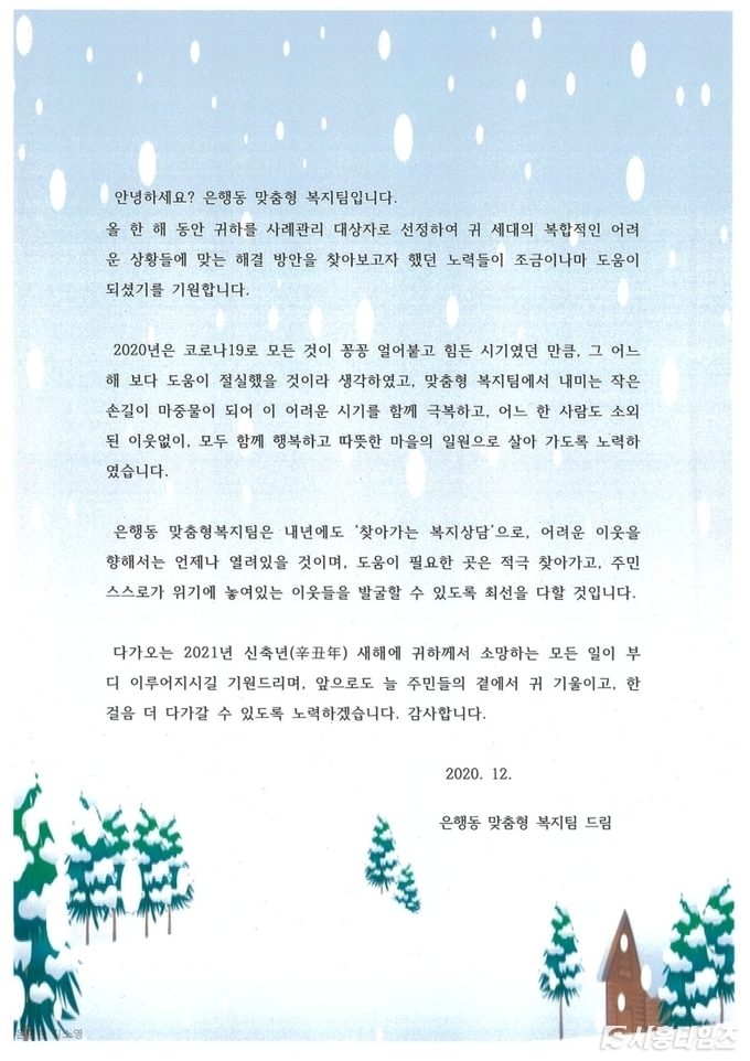 [시흥타임즈] 은행동 행정복지센터 맞춤형복지팀은 지난 한 해 코로나19 등 복합적인 위기상황을 극복하기 위해 함께한 2020년 사례관리대상자에게 사례관리 종결을 알림과 동시에 이들의 안부를 확인하기 위한 편지를 발송했다.2020년 한해는 코로나로 시작하여 코로나로 끝났다는 말이 있을 정도로 모두가 힘든 상황이었다. 이에 은행동은 특히 어느 누구보다 도움이 절실했을 사례관리대상자에게 손을 내밀어 얼어붙은 마음이 녹을 수 있도록 최선을 다했다.