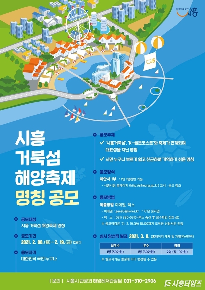 [시흥타임즈] 시흥시가 8일부터 19일까지 12일간 ‘시흥거북섬 해양축제’의 명칭을 공모한다. 첫 축제의 장을 여는 만큼 시민들의 관심도를 높이고, 시흥거북섬을 널리 알리기 위해서다.‘시흥거북섬 해양축제’는 시흥시만의 특화된 해양레저문화를 오롯이 담아 해양레저문화를 선도하는 해양명품 도시 시흥의 비상을 도모하기 위한 축제로, 올해 처음 개최된다. 해양레저 체험프로그램과 문화예술 행사 등 다양한 콘텐츠로 구성될 예정이다.