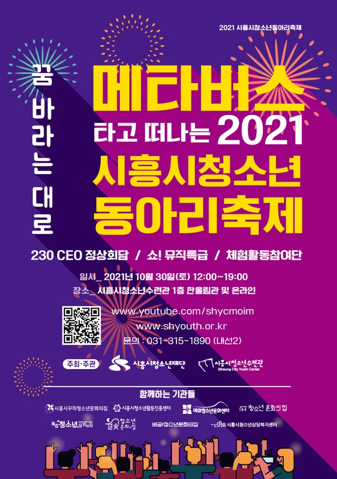 시흥시청소년재단 관계자는 “코로나19로 인해 위축된 청소년동아리 활동이 이번 축제를 통해 더욱 활성화되기를 바라며, 청소년들이 끼와 재능을 마음껏 펼치는 장이 되길 바란다”고 밝혔다.