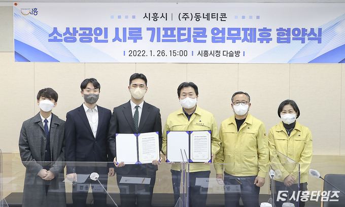 이와 관련해 시흥시는 골목상권 전용 기프티콘 앱을 운영할 ㈜동네티콘과 1월 26일 시흥시청 다슬방에서 ‘시루 동네티콘 업무 협약식’을 개최했다.