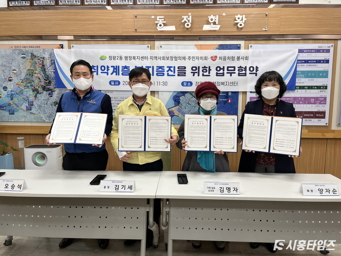 [시흥타임즈] 정왕2동 행정복지센터는 어려운 이웃을 살피고 더 가까이 다가가기 위한 다양한 노력을 진행 중이다. 지난 16일에는 정왕2동 지역사회보장협의체(위원장 장혜동)·주민자치회(회장 양자순) 및 시흥시 처음처럼 봉사회(회장 오승석, 이하 봉사회)와 함께 정왕2동 취약계층의 복지증진을 위한 협약을 체결했다.