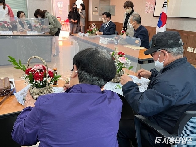 [시흥타임즈] 정왕2동 행정복지센터와 정왕2동 주민자치회가 지난 4일 노인회 어르신들을 대상으로 자치계획 간담회 및 힐링 꽃꽂이 사업을 함께했다. 이날 우리 마을에 오랜 기간 거주해온 어르신들의 말씀을 통해 우리 마을의 오랜 특성, 장단점, 문제점, 주민 숙원사항 등을 파악하고 이를 주민자치회 자치계획에 반영할 수 있는 간담회가 마련됐다.