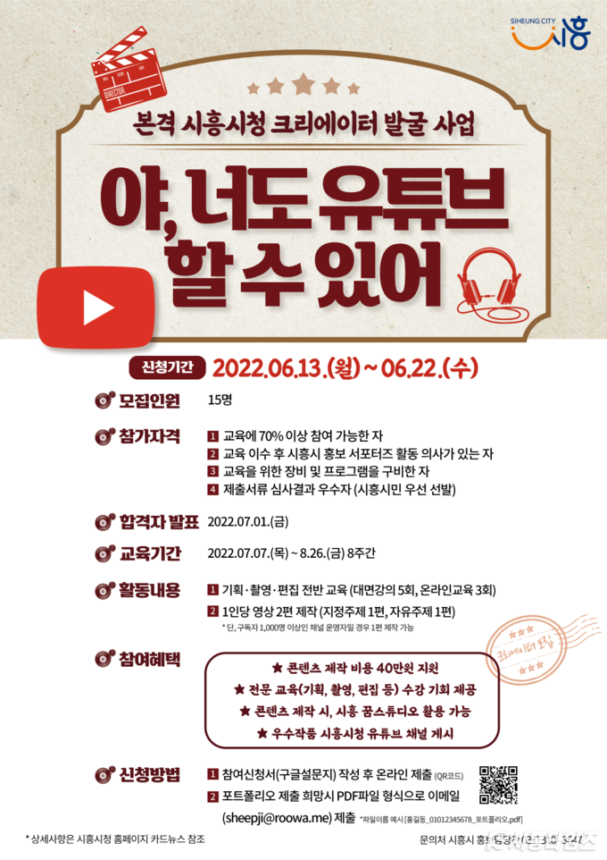 교육 참여자에게는 △크리에이터 전문 교육 수강 기회 제공, △영상 콘텐츠 제작비용 40만원 지원, △콘텐츠 제작 시 시흥 꿈스튜디오 활용 가능, △우수작품 선정 시 「시흥시청」 유튜브 채널 게시 등의 혜택이 주어진다.