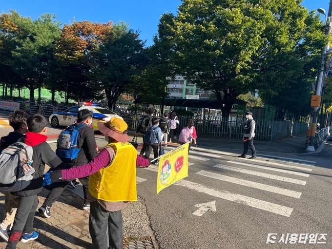[시흥타임즈] 시흥경찰서 정왕지구대가 어린이들의 스쿨존 교통사고예방을 위해 새학기가 시작되는 3월부터 현재까지 매일 등‧하교시간(8~9시, 13~14시)에 경찰관과 순찰차를 거점배치해 어린이 교통사고Zero化를 위한 프로젝트를 추진하고 있다.코로나19로 중단된 등교가 다시 재개됨으로써 스쿨존 어린이 교통사고 위험이 부각되고 있다.