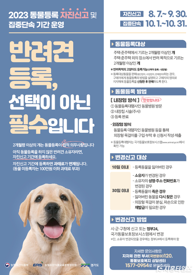 [시흥타임즈] 시흥시(시장 임병택)가 8월 7일부터 9월 30일까지 2개월간 ‘2023년 동물등록 자진신고’ 기간을 운영한다. 이번 자진신고 기간은 성숙한 반려동물 문화 정착을 유도하고, 유실ㆍ유기동물 발생 예방을 위해 마련했다.