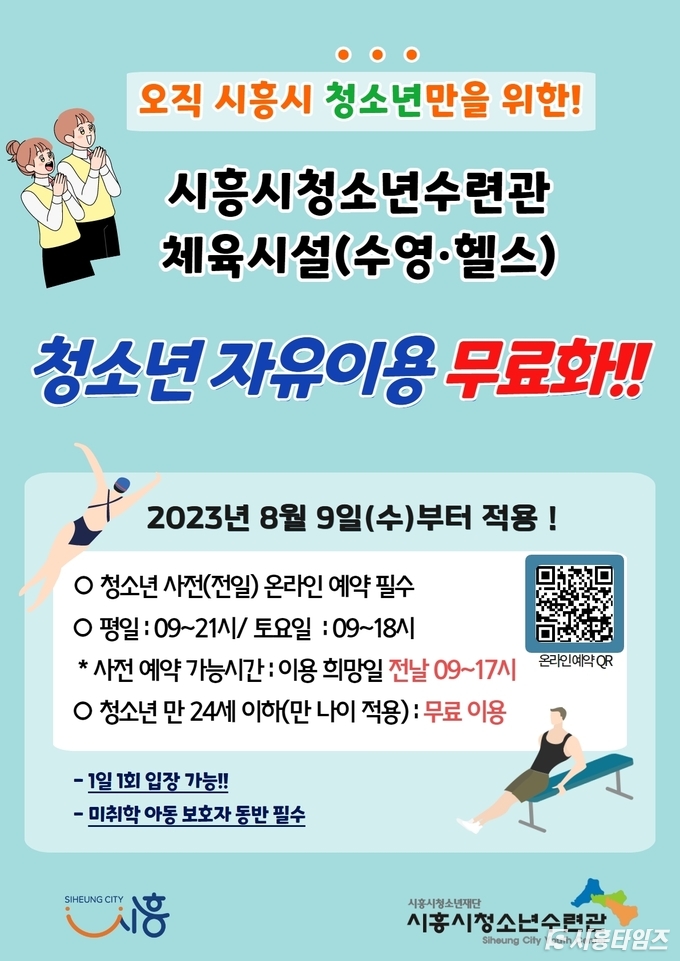 [시흥타임즈] 시흥시가 9일부터 관내 청소년을 대상으로 시흥시청소년수련관의 체육시설(수영ㆍ헬스) 자유 이용 부분을 무료로 운영한다. 이번 무료화는 8월 9일 청소년들의 의견을 수렴해 진행된 ‘시흥시 청소년시설 설치 및 운영 조례’의 개정ㆍ공포를 통해 진행됐다. 이에 따라 경기도 내 성남에 이어 두 번째로 청소년수련관 체육시설(수영ㆍ헬스)의 자유 이용 무료화를 운영하게 됐다.