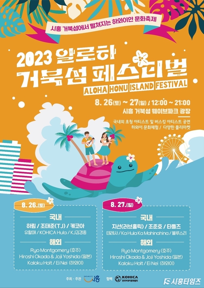 [시흥타임즈] 시흥시가 오는 8월 26일과 27일 이틀간, 시화MTV 거북섬 웨이브파크 광장에서 ‘2023 알로하 거북섬 페스티벌’을 개최한다.‘2023 알로하 거북섬 페스티벌’은 시화MTV 거북섬을 세계적인 해양레저관광 명소로 특화할 수 있는 축제 브랜드로 만들기 위해 마련된 문화 축제다.
