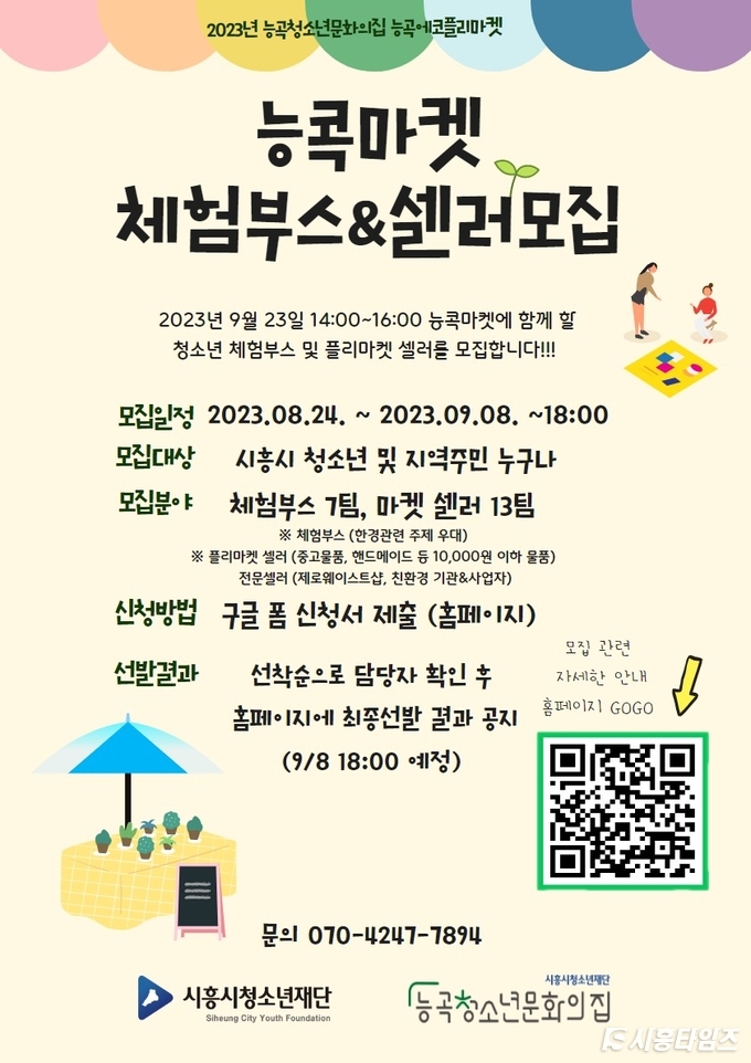[시흥타임즈] 능곡청소년문화의집(관장 김재훈)에서 운영하는 2023년 하반기 에코플리마켓 ‘능콕마켓’에서 벼룩시장(플리마켓) 판매자(셀러)와 청소년 체험 부스 운영자를 오는 9월 8일까지 모집한다.‘능콕마켓’은 지역 내 에코ㆍ나눔문화를 확산하고 다양한 환경 관련 체험 거리를 청소년에게 제공하기 위해 기획됐다. 오는 9월 23일 능곡어울림센터 앞마당에서 오후 2시부터 4시까지 운영한다.