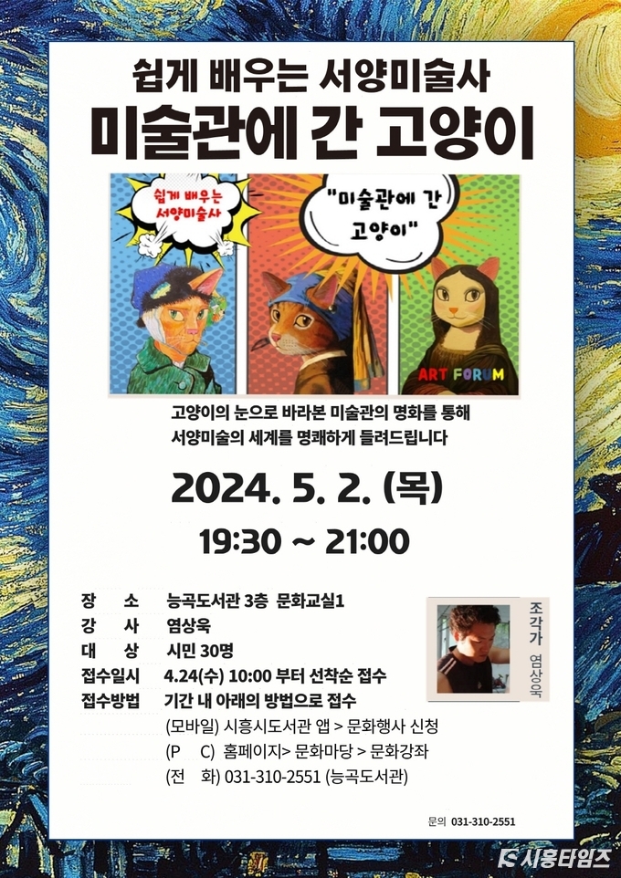 [시흥타임즈] 시흥시 능곡도서관이 오는 5월 2일에 지역 예술단체 ‘시흥 아트포럼(지역의 문화예술진흥을 위한 문화정책연구 및 제언을 위한 예술인 단체)’과 협업해 ‘미술관에 간 고양이’ 강좌를 운영한다. 이는 시민들의 문화 예술적 소양을 향상하고, 지역의 문화 네트워크를 강화하고자 기획된 프로그램이다.