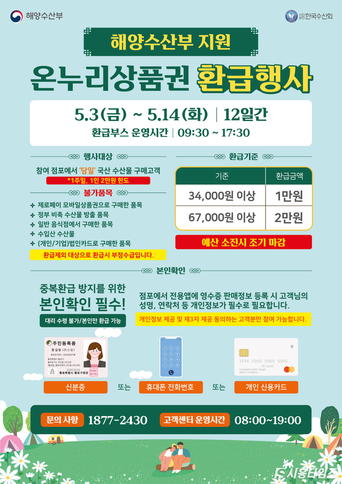 [시흥타임즈] 시흥시(시장 임병택)가 오이도 전통수산시장에서 국내산 수산물을 구매하는 소비자에게 최대 30%를 온누리상품권으로 환급해 주는 행사를 시행한다.5월 온누리상품권 환급행사는 5월 3일부터 14일까지 진행된다. 행사 기간 중 오이도 전통수산시장 내 수산물 판매 점포 43곳에서 당일 결제한 영수증과 신분증을 지참해 9시 30분부터 17시 30분까지 환급 부스를 방문하면 일주일 단위로(3~9일, 10~14일) 구입 금액에 따라 최대 1인당 2만 원의 온누리상품권을 환급받을 수 있다.
