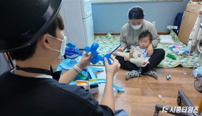 ▲마술동아리 마피아가 소아병원 어린이를 대상으로 마술쇼를 펼치고 있다.
