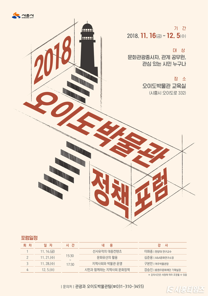 시흥시가 오는 16일부터 내달 5일까지 4회에 걸쳐 ‘2018 오이도박물관 정책포럼’을 개최한다. 이번 정책포럼은 시흥 오이도박물관(2019년 하반기 개관예정)과 지역사회가 상생할 수 있는 활용방안을 마련하기 위해 마련됐다. 지역 시민과 관계 공무원 등이 참여할 예정이다.